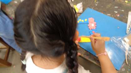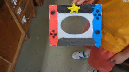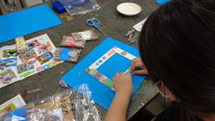 カラフル粘土を使って、写真用の額縁を作っています。それぞれ工夫しながら、素敵な写真立てができそうです。