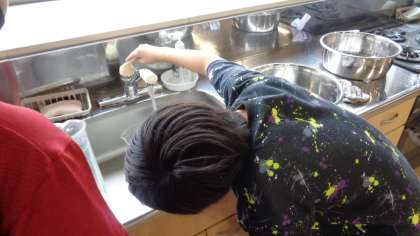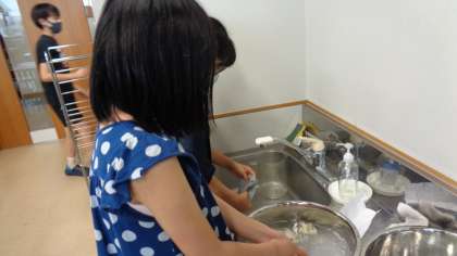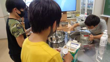 授業では、靴下の洗濯(手洗い)の学習です。汚れを見て、どんな洗い方がいいのか、生地をいためない洗い方はどんな洗い方なのか。水やせんざいの量は?みんなで考えながら、実習していました。