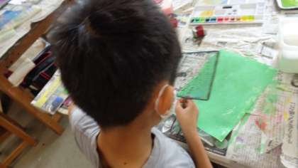 歯ブラシや刷毛などいろんな道具を使って、絵の具を塗り、自分のいろがみを作ります。