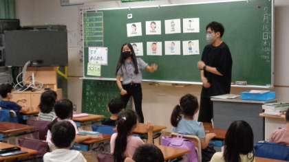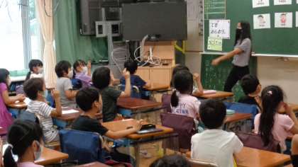 How are you? I'm〜.のやり取りをジェスチャーゲームの中でやっています。先生のジェスチャーを見て、その時の気分を英語で話せていました。