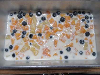 今日のフルーツヨーグルトには旬の生ブルーベリーを加えました。さわやかな甘さがヨーグルトによく合います。