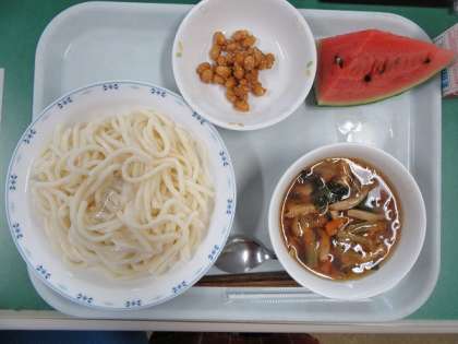 今日の南蛮うどんの具は熱い汁に、うどんは水冷し氷を加えています。暑い日でもしっかり食べられるようにつけ麺にして、しっかり食べていました。