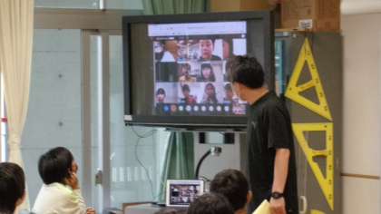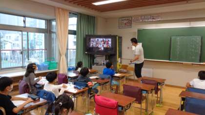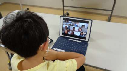 分散登校初日。B班の子どもたちをオンラインでつないで朝の会が行われました。画面を通して、手を振りあったり、声を掛けあったりしていました。