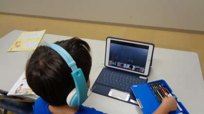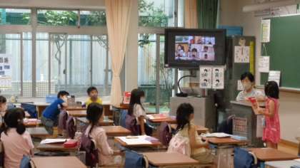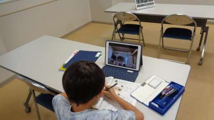 学童に来た児童もオンラインで授業に参加しています。先生の質問に、画面越しに答えていました。