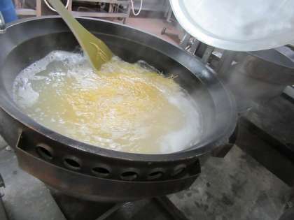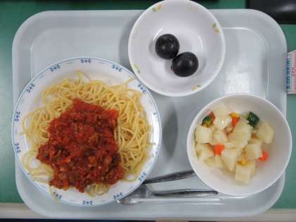 スパゲティは2回に分けて回転釜でゆでています。1度に20kgのスパゲティをゆで、水分を切り麺がつかないように油を混ぜて各学級に配缶していきます。