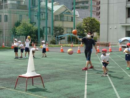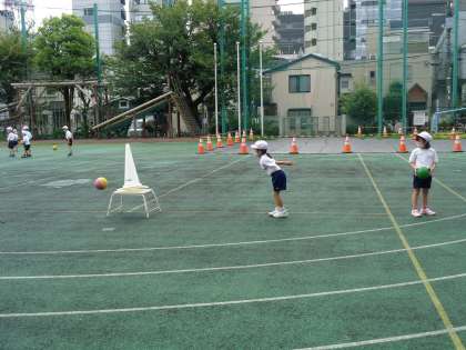 体育で大きなボールを投げる学習です。自分の手のひらよりも大きなボールを投げて的をたおす活動をしていました。ボールをどう持ったらいいのかな?どんな形で投げると遠くまで飛ぶんだろう?先生に教えてもらいながら、一生懸命練習していました。