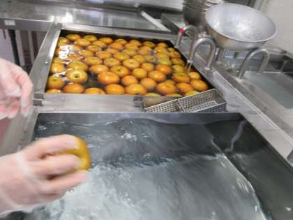 今日のくだものは旬の梨です。果物や野菜は流水でしっかり洗います。3層シンクで3回流水で汚れを取っています。