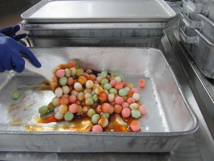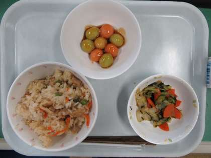 今夜は十五夜、お団子などをお供えして月見を楽しみます。3色の白玉団子にみたらしダレをかけたお月見団子にしました。