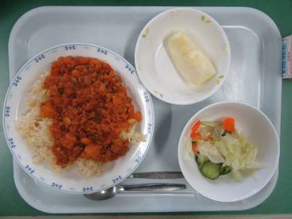 今日はカレー味に炊いたごはんにチリコンカンをかけるチリビーンズライスです。豚レバーミンチを少し加えて鉄分を強化しています。チリペッパーとカレー粉の香りでレバーの臭みを減らしています。