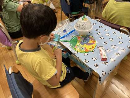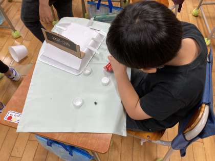 図工では、ペットボトルやトレーを使って、好きな動物を作っています。「ぼくはカメを飼っているから、カメを作るんだ」うれしそうに教えてくれました。