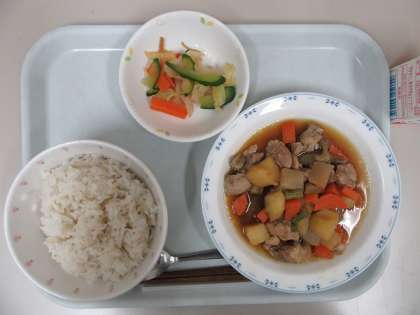 今日の炒り鶏煮にはごぼう・れんこんが入っています。しっかり噛むことで、あご周りの筋肉が動き脳に刺激を与え集中力アップにつながります。噛むことを意識した献立になっています。