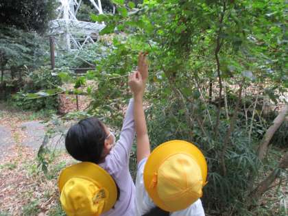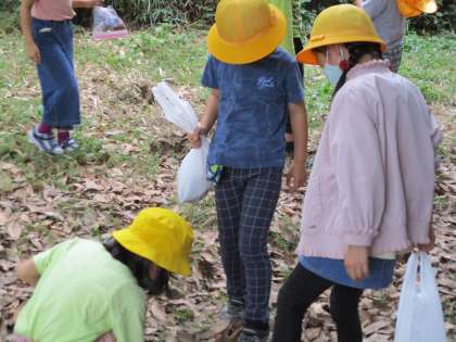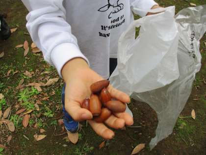 木の実、いろいろな色の落ち葉、虫。一生懸命探しています。