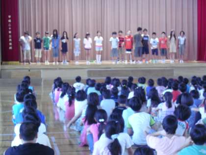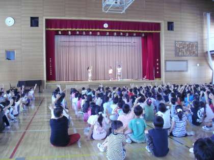 今朝の児童集会は、運動委員会の発表でした。「休み時間後の行動で、正しいのはどちらでしょう。」「運動用具の使い方で正しいのはどちらでしょう。」などの問題を、二択の寸劇にして見せてくれました。いつ練習したのかと驚く演技力で、全校児童は楽しそうに見ていました。