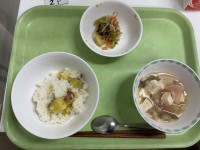 角切りに切った野菜・じゃがいもをゆで、しっかり冷まします。ドレッシングをあえてマセドアンサラダのできあがりです。マヨネーズではなくフレンチドレッシングであえていますが、ポテトサラダは人気があり、しっかり食べています。