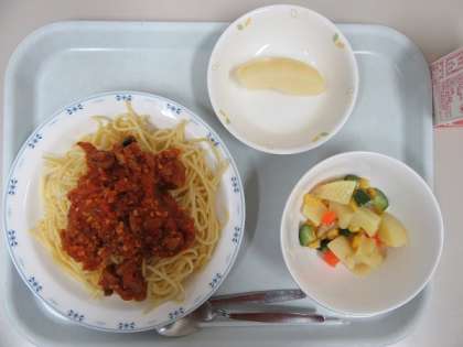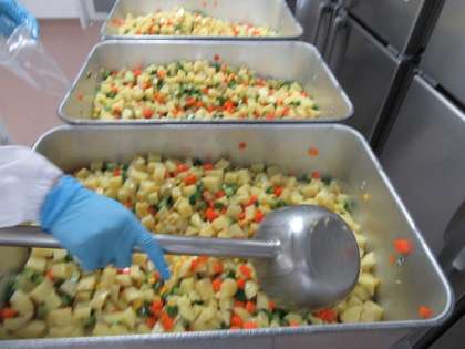 角切りに切った野菜・じゃがいもをゆで、しっかり冷まします。ドレッシングをあえてマセドアンサラダのできあがりです。マヨネーズではなくフレンチドレッシングであえていますが、ポテトサラダは人気があり、しっかり食べています。