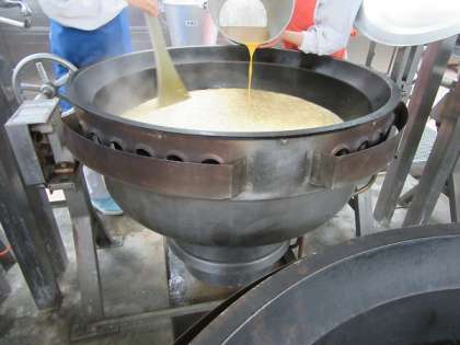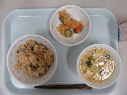 かきたま汁に使用する鶏卵は納品後1個ずつ割卵して溶きます。その後ざるにこし、殻が入らない様に安全に気をつけて調理しています。とろみをつけたすまし汁に少しずつ鶏卵を流し入れてかきたま汁をつくります。