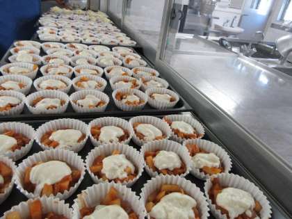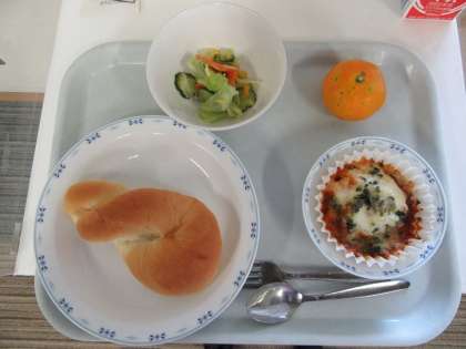 明日は運動会、給食室から皆さんに応援の給食を作りました。 トマトソースと混ぜたじゃがいもをカップに入れ、上からホワイトソースとチーズとパセリを乗せました。赤と白両方とも給食室で手づくりの、おいしい1品です。