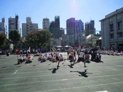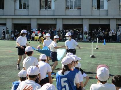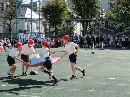 やわらかいマットの上に置いたものを慎重に、すばやく運ぶ競技です。友達と心を合わせて運びました。