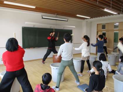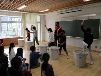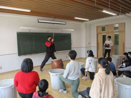 120周年式典にむけ、和太鼓の練習中です。駒沢小には、小さい時から和太鼓をやってきた先生がいます。先生から指導を受け、子ども達の目も真剣になってきました。