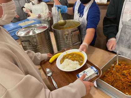 バンダナを巻いて配膳しています。