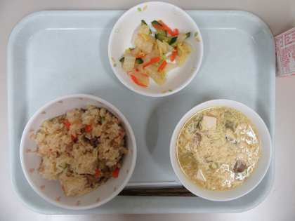 今日は中華料理の献立です。ごま油の香りが食欲を増す中華風おこわはしょうゆ味に味をつけて、かき玉スープなど一緒に食べやすい献立にしました。