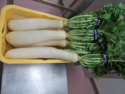 今日は世田谷区で収穫された食材(せたがやそだち)をつかう給食、せたがやそだち給食です。立派な大蔵大根が収穫されました。世田谷区喜多見でつくられた大蔵大根を給食室でおいしく調理しました。