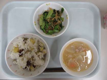 給食室で練りできた肉団子を1個ずつ釜に入れて、野菜と一緒に煮込んだ肉団子汁です。かつおぶしを多く加えて濃厚なだしと食材からのうま味で、塩分控えめのおいしい汁物ができました。