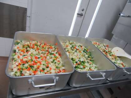 じゃがいもや野菜をゆで、しっかり冷却しドレッシングをあえてマセドアンサラダのできあがりです。量が多いので3つに分けて、ムラが出ないようにあえています。