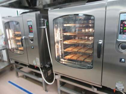 駒沢小の給食室には大きなオーブンが2台あります。2台のオーブンを使いバタートーストを焼いてます。1台にパンを約80枚入れて、焼きムラが出ないように焼いています。