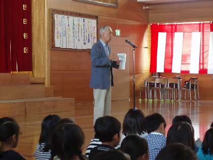 まず、同窓会会長 横溝恒雄様に、昔の学校の様子について、お話をいただきました。今とはかなり違う学校の様子に、子どもたちは聞き入っていました。