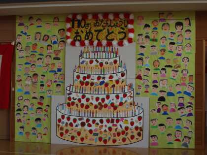 次は、5年生から、「ケーキ」の紹介がありました。これは、全校児童がパーツを作って、5年生が貼り合わせたものです。華やかな彩りで、お祝い気分を盛り上げていました。