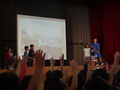次に6年生が、駒沢ヒストリーを紹介しました。「昔の校歌」「町の様子の歴史」などのテーマごとに、寸劇とクイズで紹介します。大人も知らないことを低学年の子どもたちにも分かりやすくアレンジして紹介する6年生の力は大したものだといつもながら、感心させられました。