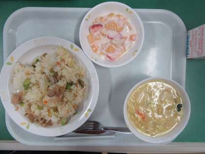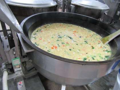 鶏ガラスープで野菜を煮て、とろみをつけ溶き卵をゆっくり加えたスープが出来上がりました。こまつなは彩りを考えて、最後に加えています。