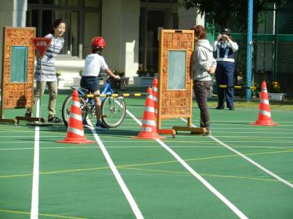 10月7日、3年生に向けて、自転車教室を行いました。当日は、世田谷警察署より2名お見えいただき、安全な乗り方について教えていただきました。その後、1人ずつヘルメットをかぶり、自転車に乗って、校庭内に作られた交差点やジグザグ道を走行しました。