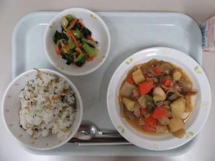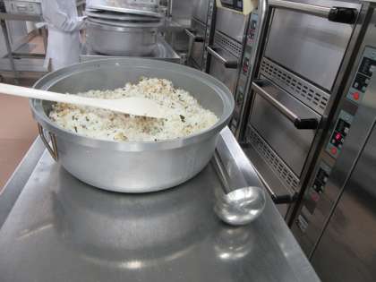 じゃこをオーブンで乾煎りをして、わかめと一緒にごはんに混ぜています。歯ごたえのあるじゃこは噛むとうま味が出て来て、しっかり噛むことができる食材です。