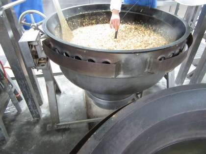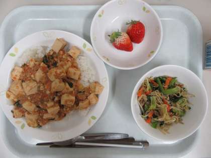 麻婆豆腐のあんには大豆・しいたけ・野菜のみじん切りを多く混ぜています。みじん切りの食材の食感とうま味がおいしい麻婆豆腐のできあがりです。最後に中心温度を確認しています。