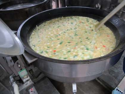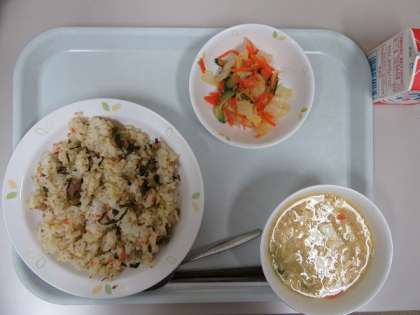 今年度の給食は今日と明日の2回となりました。今日は裏ごしコーンをかきたまスープに加えた中華スープです。卵とコーンの香りがおいしいスープです。