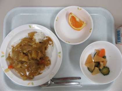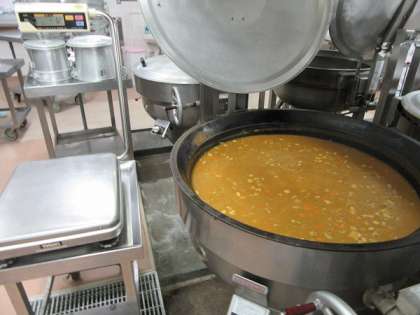 今日はカレーライス、ルウから給食室で手作りしています。じっくりと煮込んだ具にカレールウを加えてさらに煮込み出来上がりました。中心温度などを確認後、各学級ごと食缶に入れ配る作業に入ります。