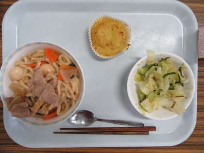 今日のデザートはスイートポテト、給食室でさつまいもを蒸して調味しオーブンで焼きました。ポテトの低中高の量を計算してカップに入れていきます。