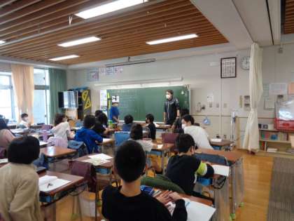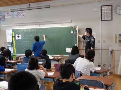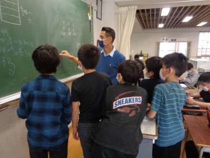 分数のわり算は、どのように考えてやるか、とても説明の難しいところです。子どもたちは自分の考えを友達を前に説明していました。わからない、まだ納得できない。そんな時は、授業が終わってからも先生のところに来て、質問しています。
