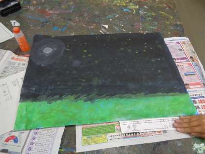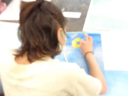 自分の思いを空の色にたくして表現していました。なんとも表現しがたい微妙な色合い、子ども達の様々な思いが空の色に表現されていました。