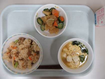 米ともち米をしょうゆ味に炊き、たっぷり野菜と豚肉を加えた具と混ぜた中華風おこわができあがりました。シャキシャキとした食感の具とモチモチとした食感のおこわで、歯ごたえも楽しめる献立になっています。