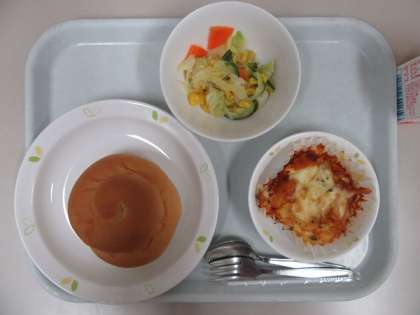 今日は運動会応援献立、トマトソースとホワイトソースと紅白どちらも手作りでおいしいグラタンをつくりました。ソースは完成したものの総量を量り、1人分を計算して1個ずつカップ入れしていきます。