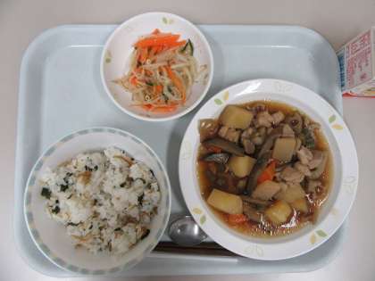 今日は炒り鶏煮、シャキシャキとした食感の根菜を多く加えた煮物です。