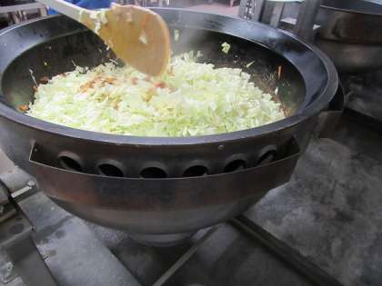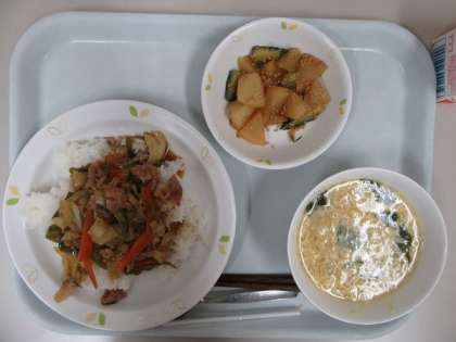大きめに切ったキャベツをたっぷりと入れた回鍋肉を調理しています。副菜も乱切りにして、よく噛むことを意識した献立になっています。