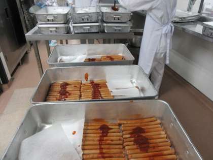 今日はウインナーサンド、ソーセージとシ野菜ソテーを一緒に食べることでしっかりと噛むことができます。蒸したソーセージとソースを各学級にごと分け、この後ウインナーに均等にソースを混ぜていきます。