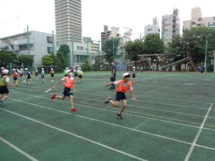 体育でリレーの学習をしています。どうやったら、チーム全体が速くなるのか、バトンの渡し方、受け取り方などなど、たくさんの工夫がありそうです。子ども達の気づきを大切にしながら、より速くなるように話し合いと練習を重ねていました。