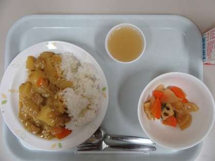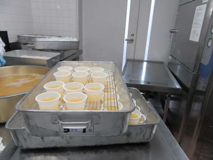 デザートのゼリーは給食室で手作りです。寒天とゼラチンを溶かしゼリー液をつくったら、カップに1つずつゼリー液を入れて冷やします。