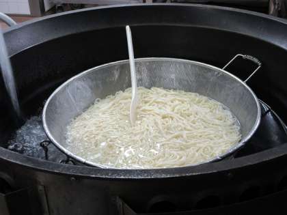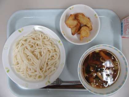 今日は暑い日にぴったりのつけめんです。うどんをゆで、19度になるまで水冷しました。配缶後に氷も加えてしっかり冷やします。具だくさんなめんつゆにして、しっかり野菜や肉などを食べられる献立です。