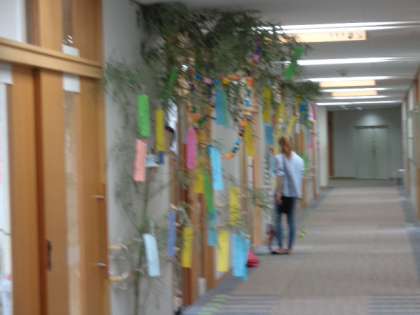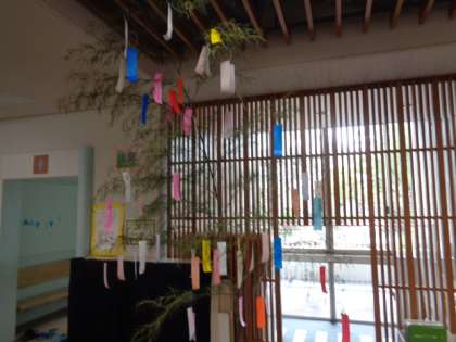 学校支援コーディネーター(地域)の方や、学校運営委員の方、PTAの方が、七夕用の立派な笹竹を運んでくださいました。笹竹は駒小とも縁のある「秋山農園」からご提供いただいたものです。子どもたちはそれぞれに短冊に願い事を書き、笹に結びつけていました。